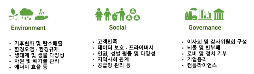 ESG는 환경(Environment), 사회(Social), 거버넌스(Governance)를 뜻하는 용어로 『기업의 환경 파괴 및 사회적 책임에 대한 외면과 위험을 예방하며 건전한 거버넌스 구축을 통해 부정부패를 방지하자』는 의미를 나타낸다.